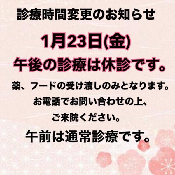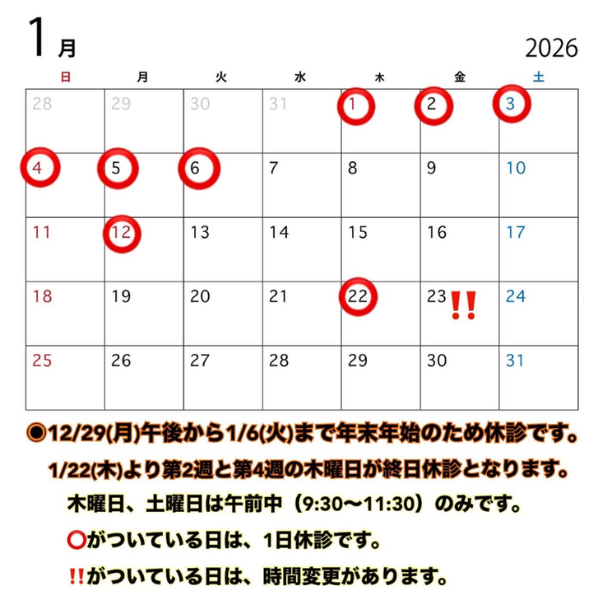 1月休診日のお知らせ お知らせ 2025.12.30 ◎1月12日(月)は祝日の為、休診です。◎1月23日(金)は午後休診です。 ◎木曜日・土曜日は午前中のみの診察。 1月22日(木)以降、第2・第4週の木曜日は終日休診となります。◎日曜日・祝日は休診です。