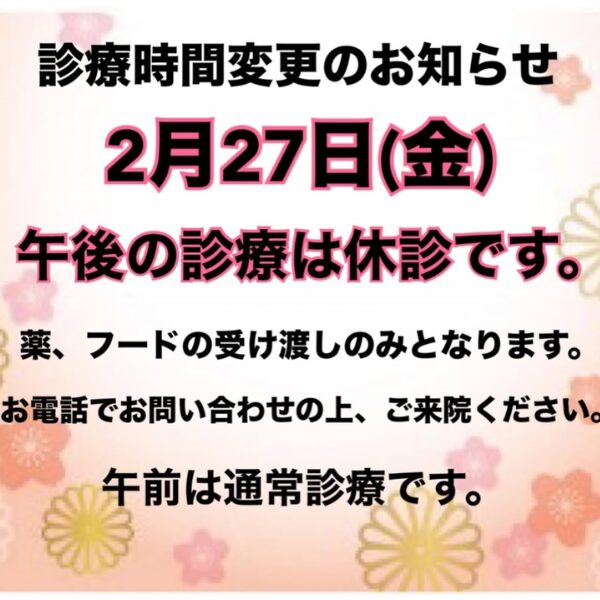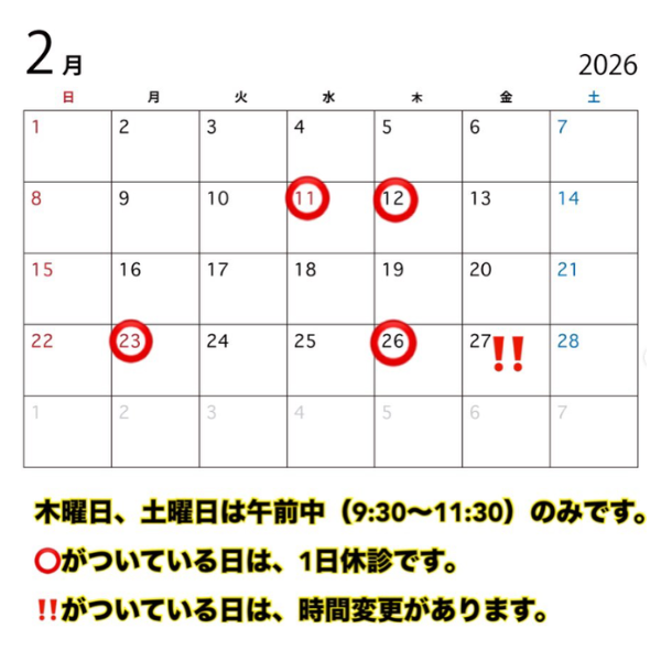 2月休診日のお知らせ お知らせ 2026.02.03 ◎2月11日(水)、23日(月)は祝日の為休診です。 ◎2月27日(金)は午後休診です。 お薬、フードの受け渡しは可能ですので、 お電話でお問い合わせの上ご来院ください。 ◎木曜日・土曜日は午前中のみの診察。 第2・第4週の木曜日は終日休診となります。◎日曜日・祝日は休診です。